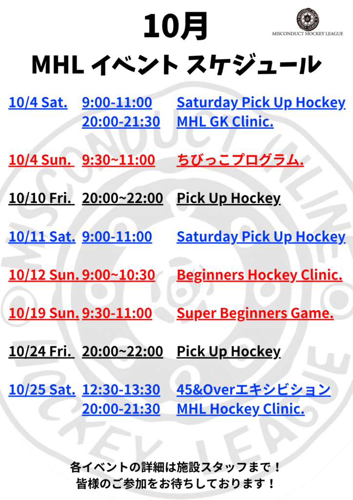・10月12日(日) 9:00-10:30 MHL Beginners Hockey Clinic