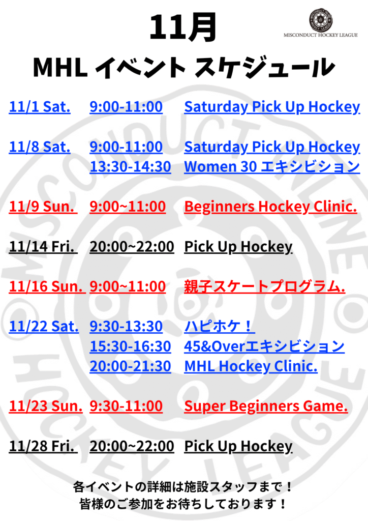 ・11月9日(日) 9:30-11:00 MHL Beginners Hockey Clinic