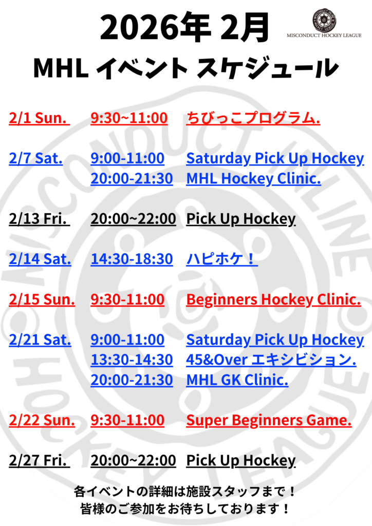 ・2月15日(日) 9:30-11:00 MHL Beginners Hockey Clinic